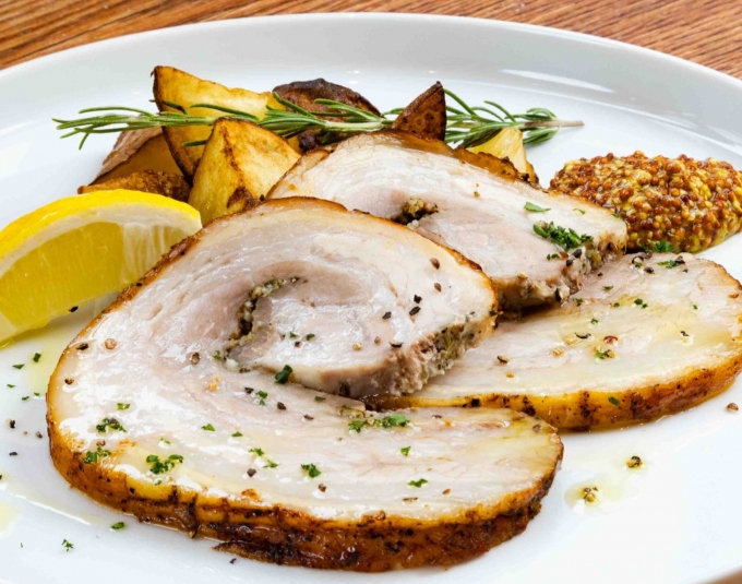 豚バラのブロック肉にハーブやガーリックを詰め、ロール状に巻き付けて低温で3時間程ゆっくりと焼き上げています。